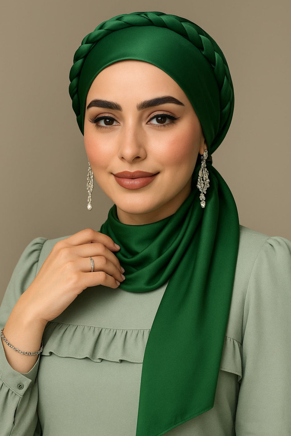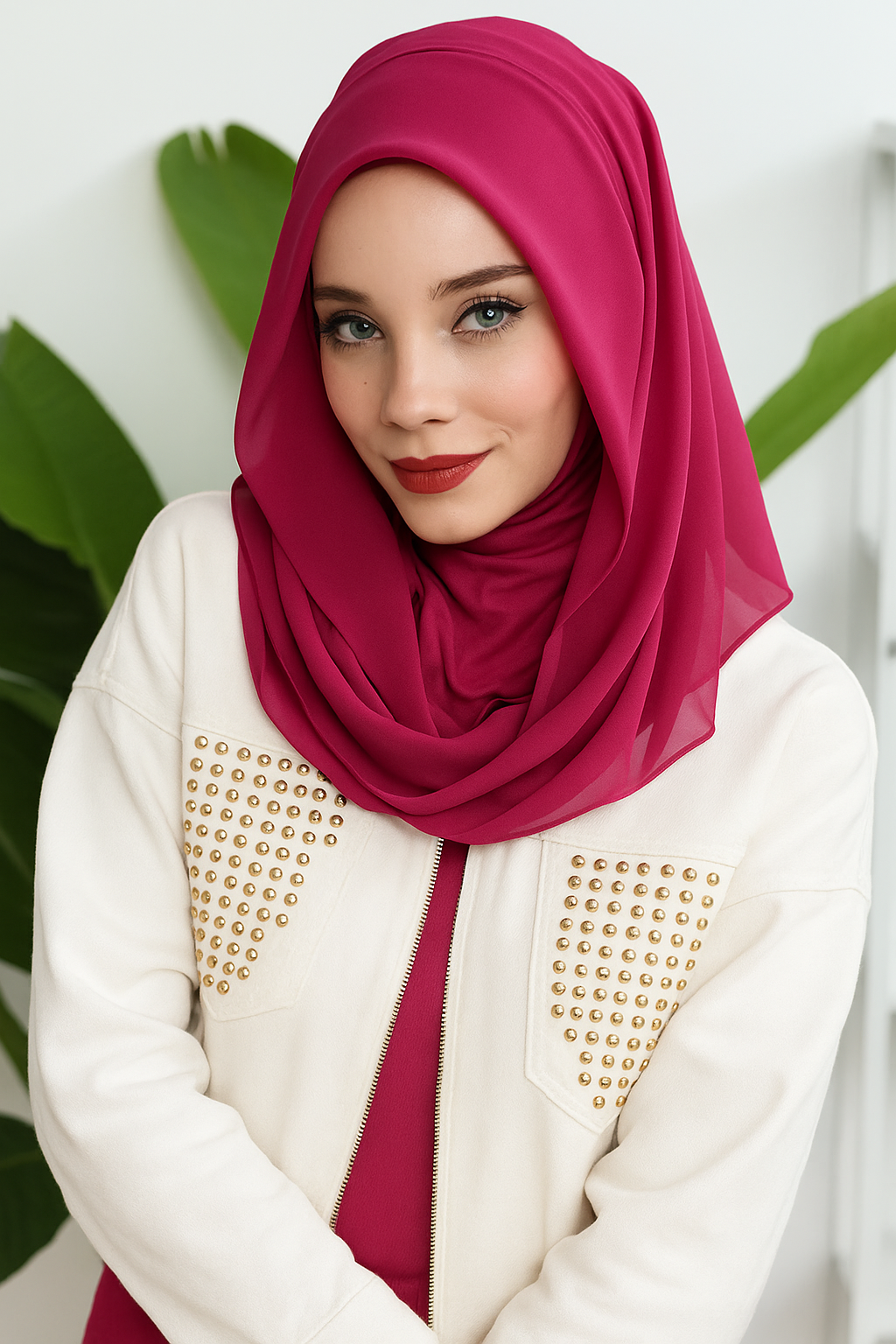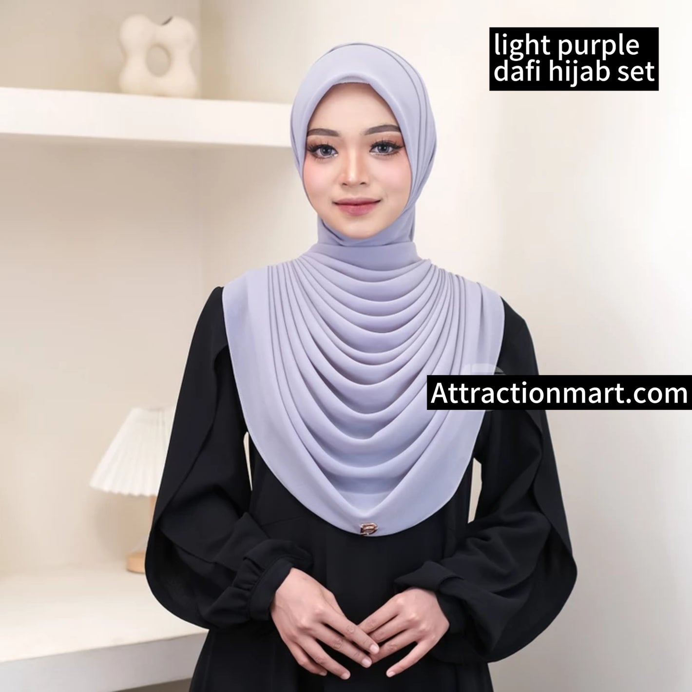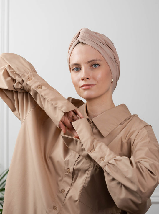 The signature pin-tuck pleats paired with metallic button detailing create a formal hijab look that’s perfect for every occasion—from university presentations to office meetings and even festive gatherings.