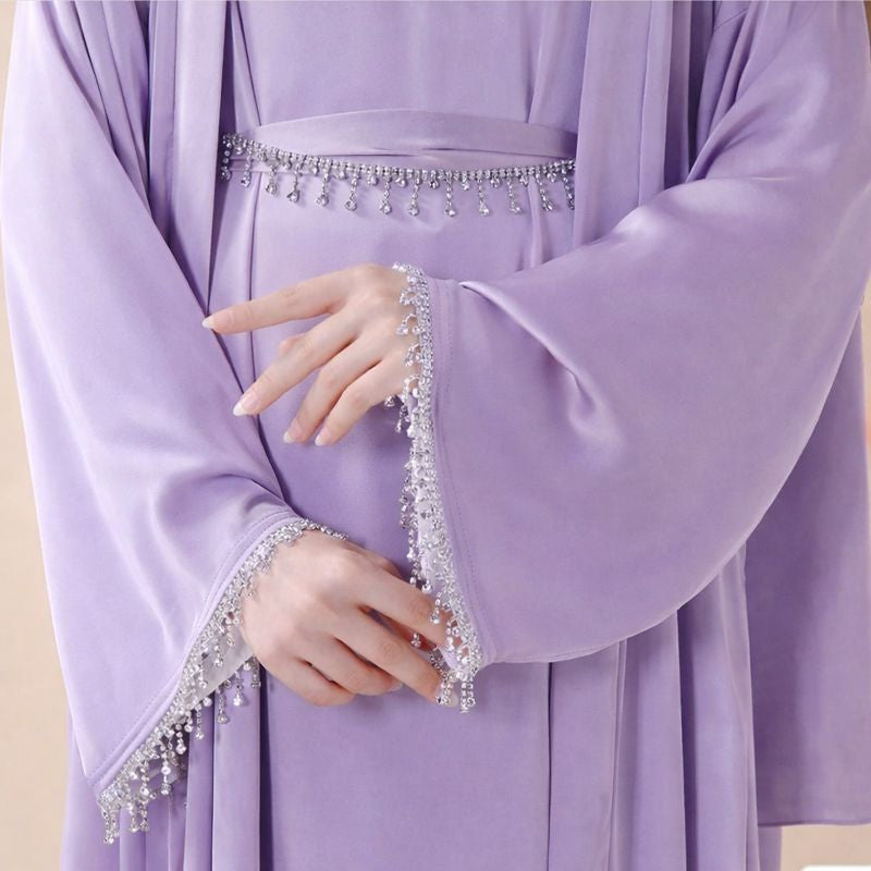 - 4-piece set: Includes open abaya, sleeveless inner dress, diamond tassel belt, and matching hijab.
