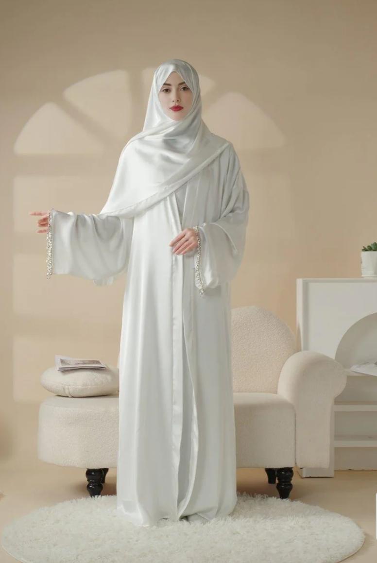 The set includes an open abaya, a sleek sleeveless inner dress, a matching hijab, and a diamond tassel belt that adds a touch of glamour. The full-length design and round neckline offer a classic silhouette, while the side slit pockets bring practicality to this refined ensemble. The flowing satin fabric provides a smooth, luxurious drape, ensuring both comfort and style.